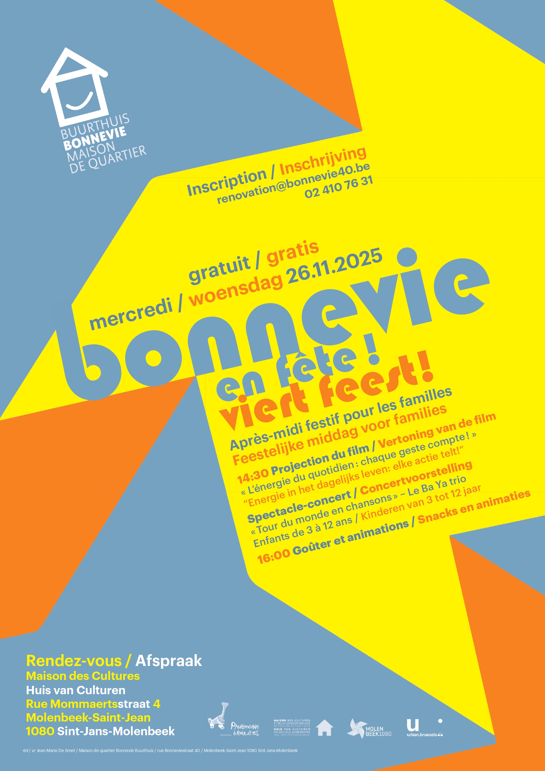 Le 26 novembre, la Maison de quartier Bonnevie clôture en beauté son projet Kermesse CRU06 avec une après-midi festif à la Maison des Cultures de Molenbeek : projection du film « L’énergie du quotidien : chaque geste compte ! », spectacle-concert du Ba Ya Trio, goûter et animations pour toute la famille.